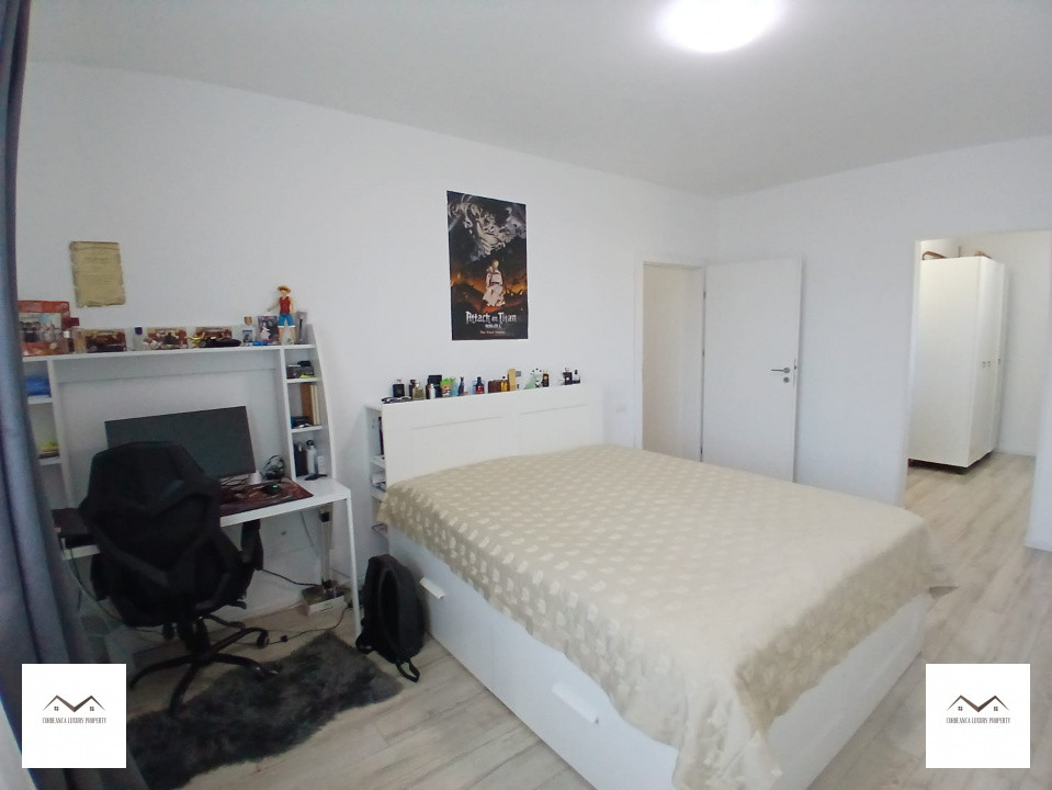 La etaj avem un hol generos 7mp, de unde regasim doua dormitoare 12.8mp si 10.4mp, baie pe hol 5.1mp si apartament matrimonial compus din dormitor 16.6mp, dressing 6.9mp si baie 7.4mp.